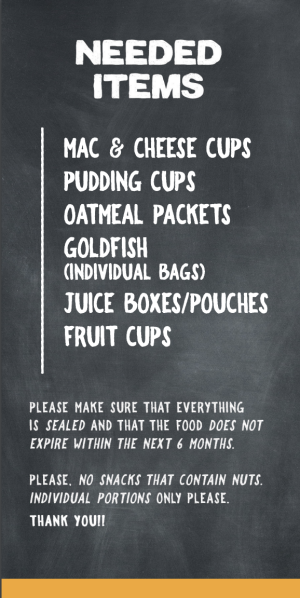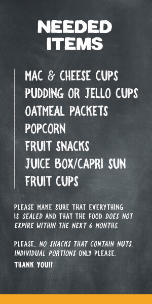 *Please bring individual portions, nothing containing nuts, and items that don't expire within the next 6 months.*